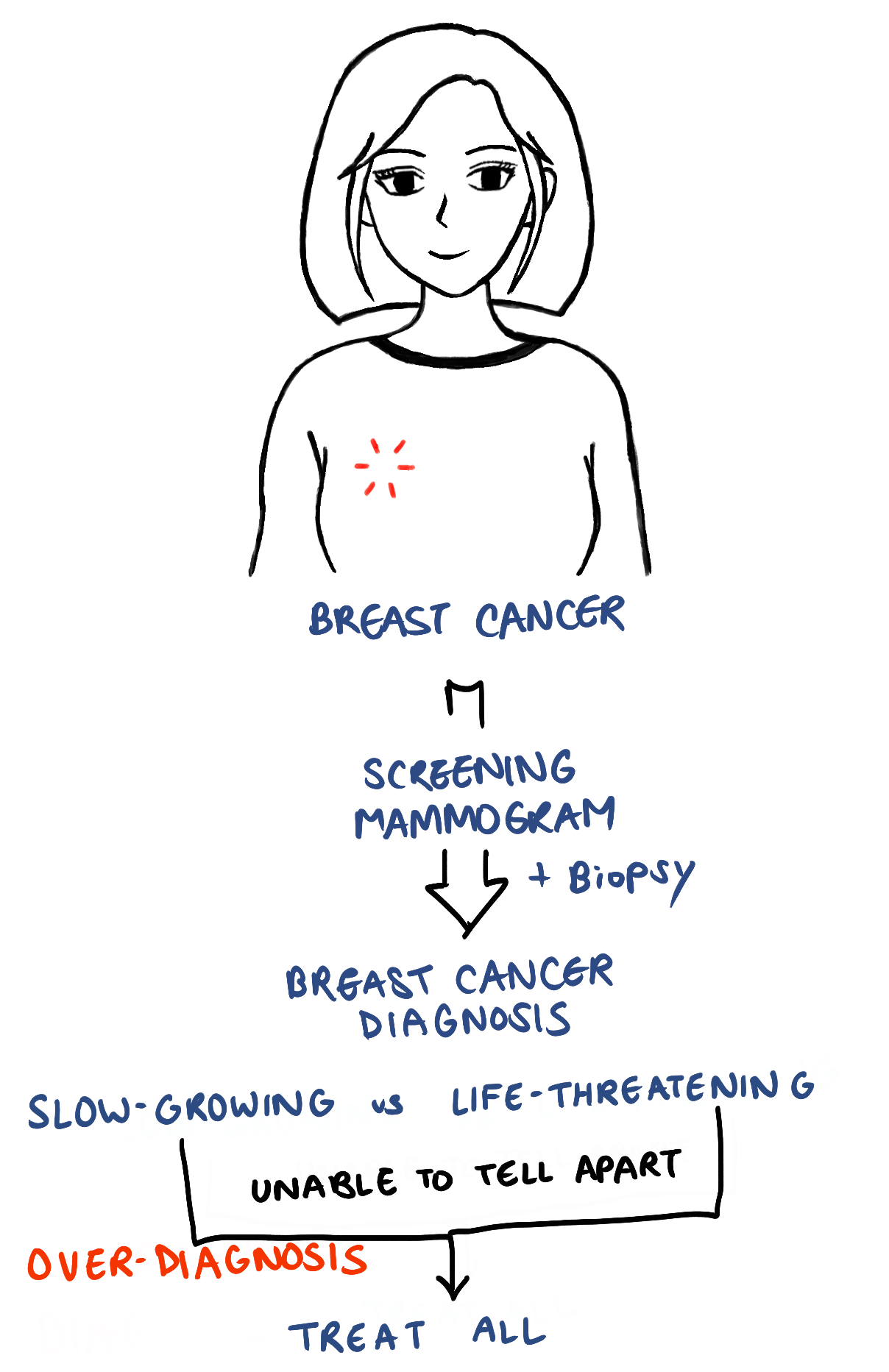 Over-diagnosis is when a screening mammogram finds breast cancer that would have grown too slowly to spread and the patient would not have died from it if left untreated. However these cancers cannot be distinguished from those that do cause death, so doctors would not risk not treating it. In these circumstances, these patients may be exposed to the negative side effects of cancer treatment that may not have been needed in the first place.