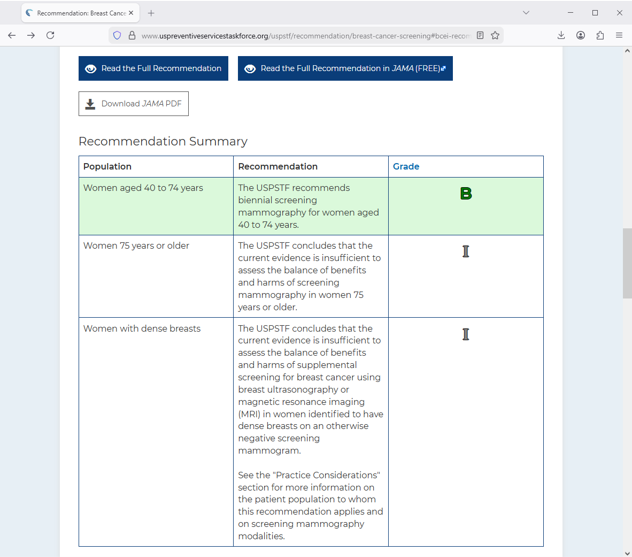 In the United States, the U.S. Preventative Services Task Force changed their recommendations in 2024 to recommend that women between 40 and 74 years old receive screening every 2 years. This was changed from its previous guidelines that advised starting at 50 years old.