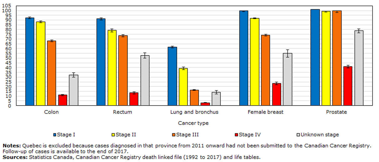 This graph shows the 5-year survival rate in percentages with the stages of when the cancer was diagnosed. We can clearly see that the survival rates are better when the cancer is detected in the early stages with the highest 5-year survival rate at stage 1 in blue which is close to 100 percent.