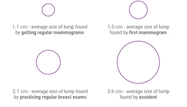 This image shows the average size of breast cancer lumps by the method of detection. It shows here that the average size of a lump found through regular mammogram screening is 1.1 cm, however the mammogram has the ability to detect even smaller masses that cannot be felt at all. This image is not to scale.