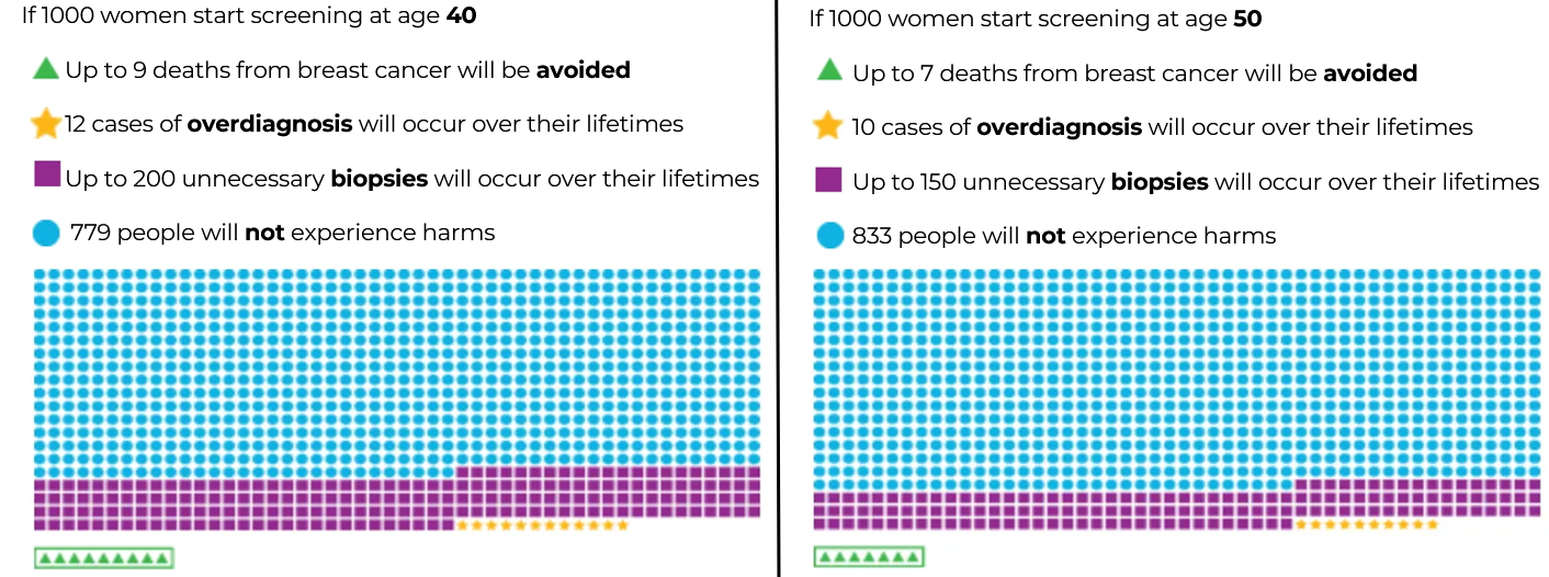 • There would be up to 200 unnecessary biopsies in the group starting at 40 year old, which is 50 more compared to the group starting at 50 years old. It is important to remember that these numbers are not referring to the results of a screening mammogram done once at 40 years old. It is estimating the total number of biopsies if these individuals started screening at 40 and continued to get screened up to 75 years of age. In other words, for the group of 1000 women starting screening at 40 years old, if we were to follow them over 35 years of screening, there would up to 200 unnecessary biopsies in this group of 1000 women in these 35 years whereas for the other group starting at 50 years old, there would be 150 unnecessary biopsies in 25 years.