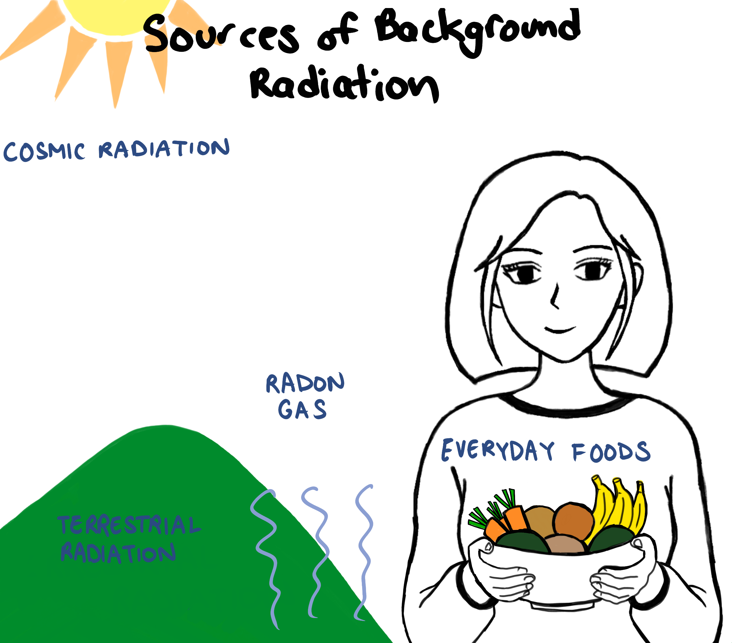 Canadians are exposed to an average of about 1.8 mSv per year from natural surroundings. Some example sources of this background radiation is cosmic radiation, terrestrial radiation and radon exposure. There’s even tiny amounts of radiation in the foods we eat.