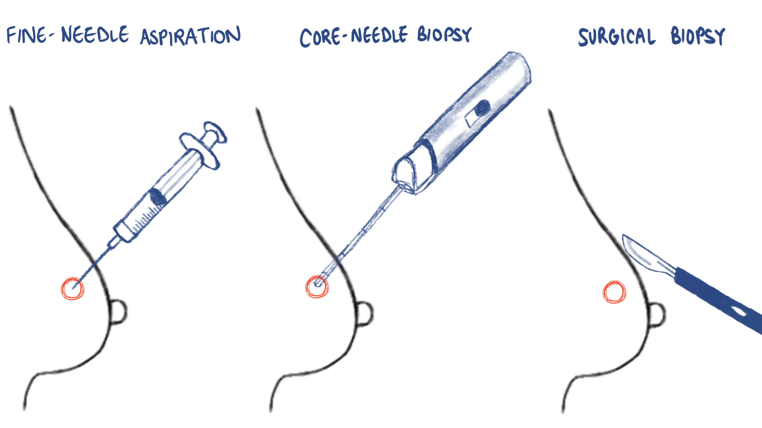 When a breast biopsy is needed, a sample of the abnormal area is taken out to check for cancer. There are different ways of getting this sample, but most commonly it is taken out through a small procedure called a Core-Needle Biopsy that uses a hollow needle under local anesthesia.