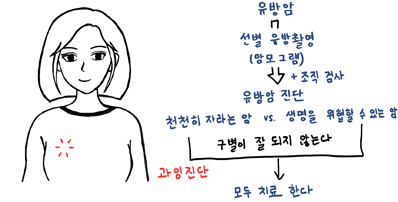 과잉진단이란, 유방암 검진으로 실제로는 매우 천천히 자라 전이될 가능성이 낮아서, 치료하지 않아도 그로 인해 사망하지 않았을 암을 발견하는 경우를 말합니다. 이러한 암은 사망을 일으킬 수 있는 암과 구별할 수 없기 때문에, 의사들은 치료 없이 두기에는 위험하다고 판단합니다. 이 경우 환자는 처음부터 필요하지 않았을 수도 있는 암 치료의 부작용에 노출될 수 있습니다.