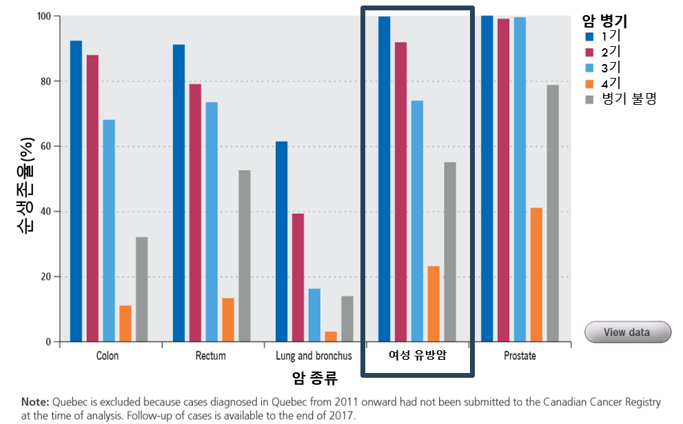보시는 것처럼, 초기 단계에서 발견될수록 생존율이 더 높으며, 특히 파란색으로 표시된 1기의 5년 생존율은 거의 100%에 가깝습니다.