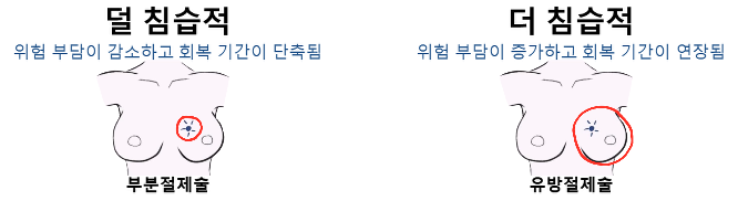 유방암 치료에서 덜 침습적인 방법으로는 종양이 있는 부위만 제거하는 부분절제술이 있습니다. 반대로 유방 전체를 제거하는 유방절제술은 상대적으로 더 침습적인 치료에 해당합니다.