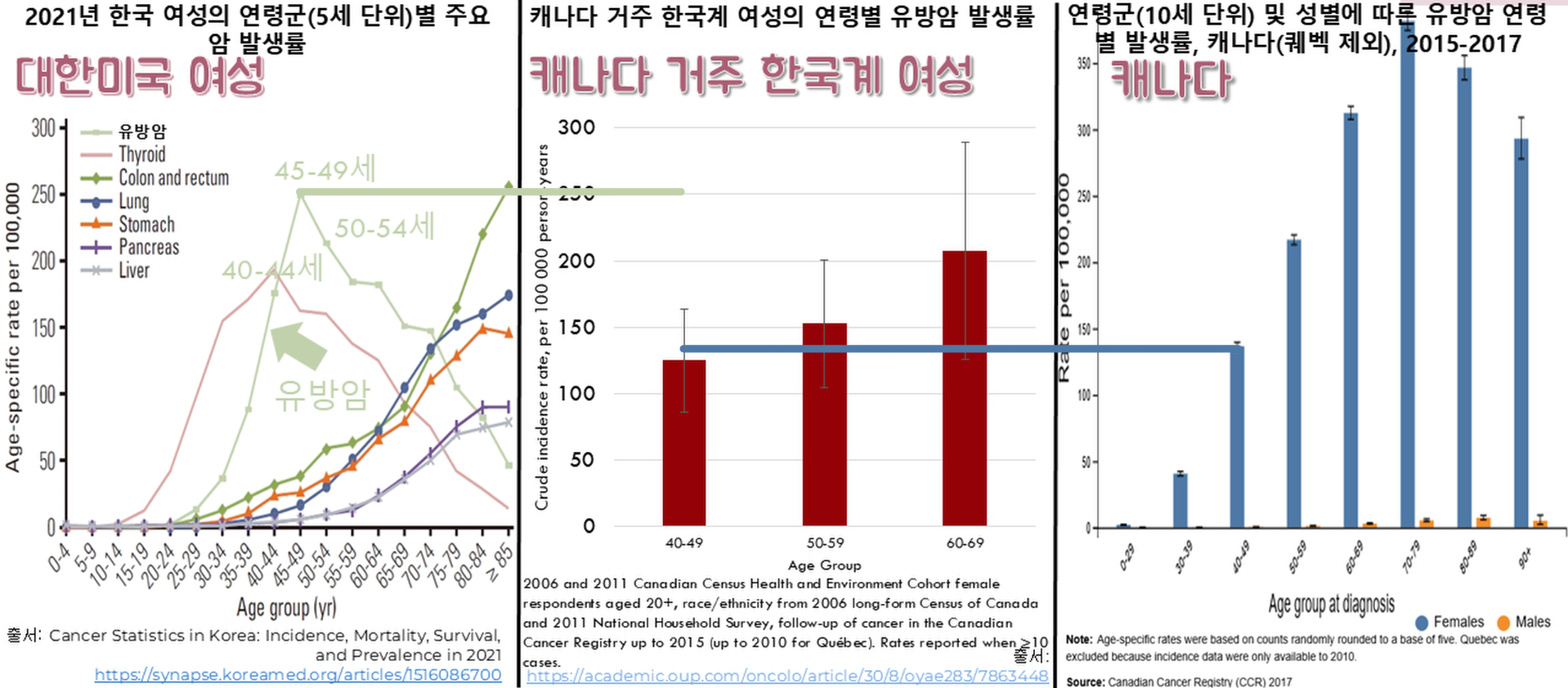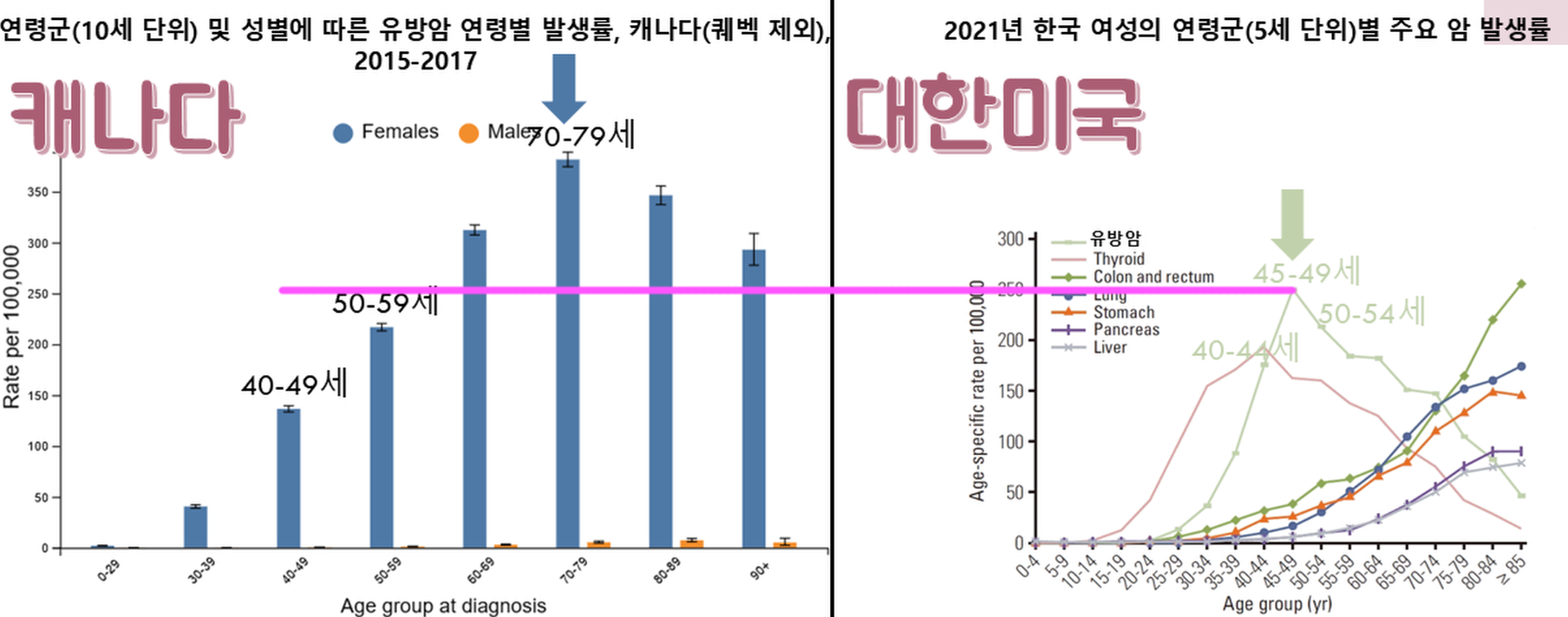 이는 한국 인구에서 유방암 발병률의 정점이 꾸준히 40대와 50대 연령층에서 나타나기 때문입니다. 반대로 캐나다에서는 유방암 발병률의 정점이 70대 연령층에 있습니다.