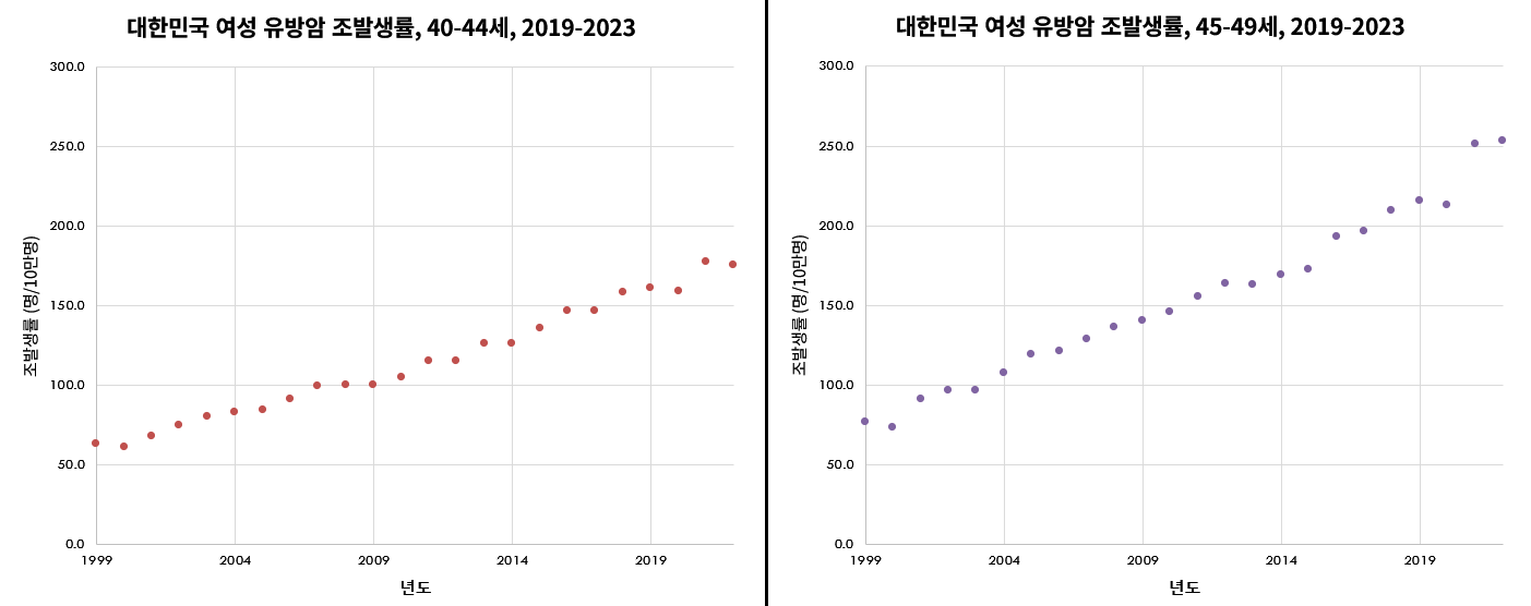 그리고 대한민국에서도 40대 여성의 유방암 증가 추세를 볼 수 있습니다.