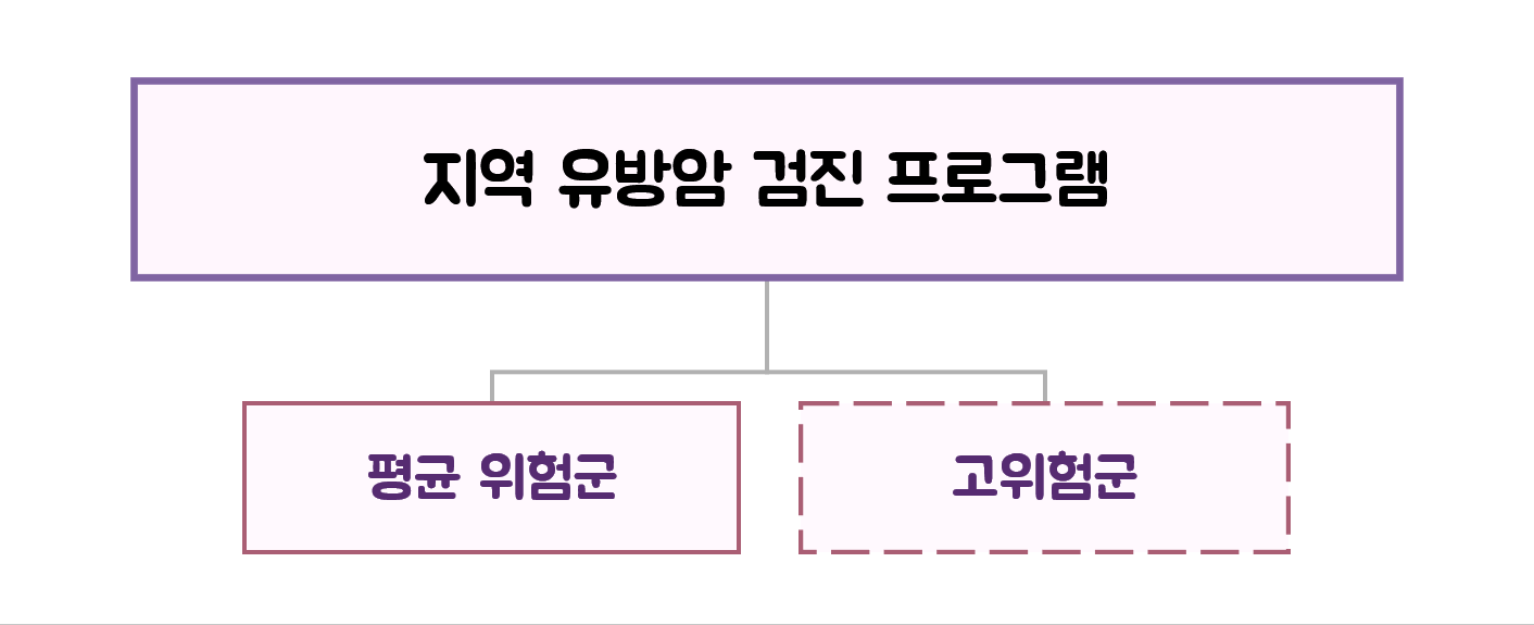 저는 평균 위험군 유방암 검진 프로그램을 중심으로 설명할 예정입니다만, 다만, 일부 지역에서는 고위험군을 위한 별도의 프로그램도 운영하고 있습니다.